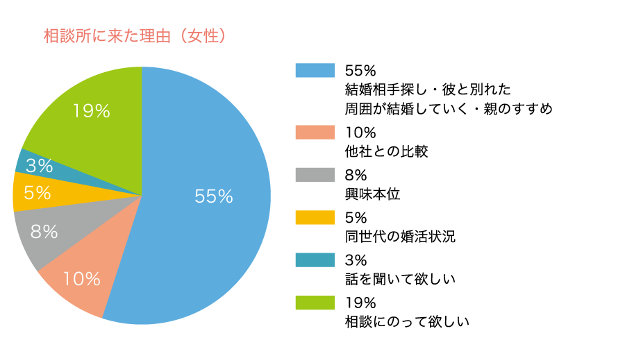 入会説明時に聞き取りした来店理由は、「自分と同じ年齢や状況の人がどうしているのか気になった」「とにかく自分の話を聞いてほしい」「相談にのってほしい」というお悩みを持った女性が4分の1を占めることが分かりました。
