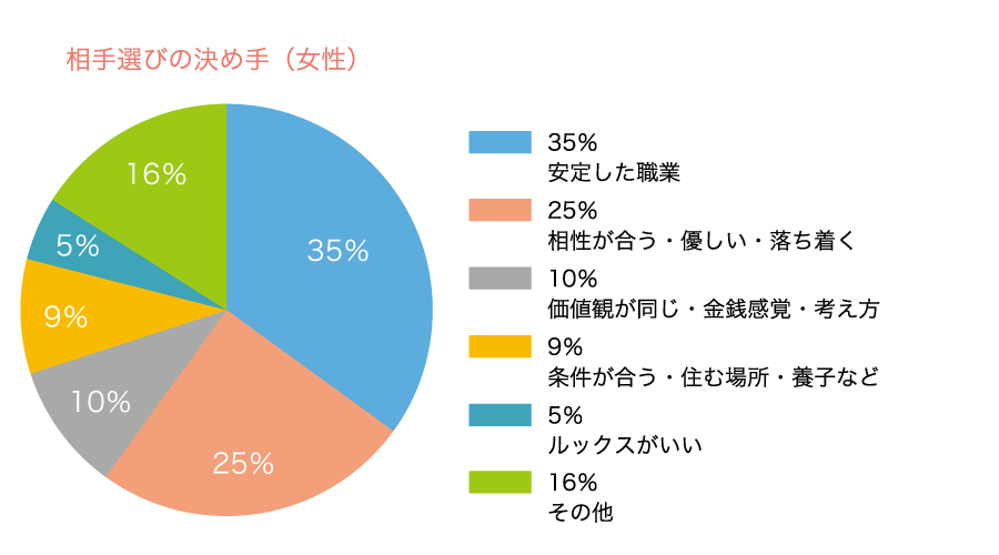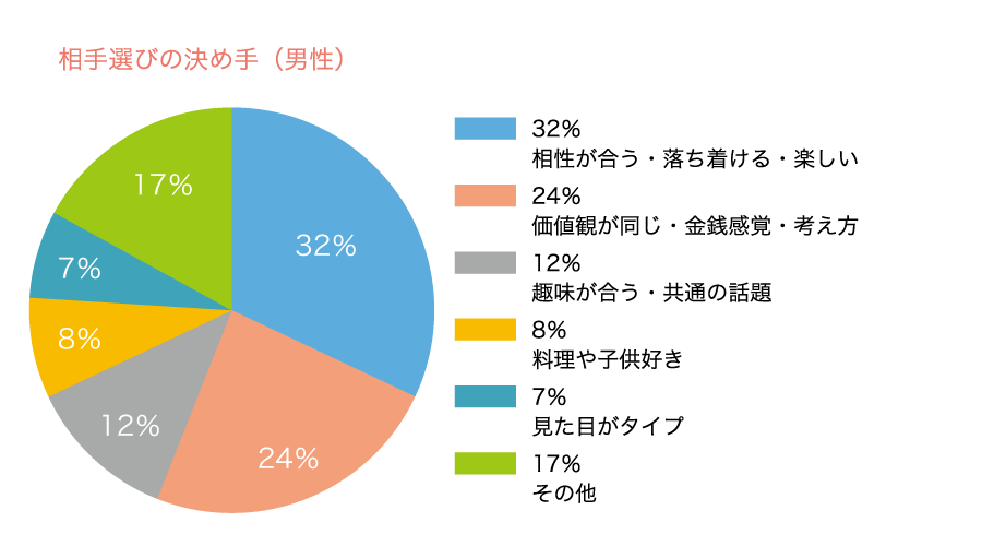 ちなみに、当協会で良い方に巡り合い、ご成婚された会員さまの決め手となった項目を挙げておきます。結婚は、長い間生活を共にします。安定や相性、価値観が多くを占めています。